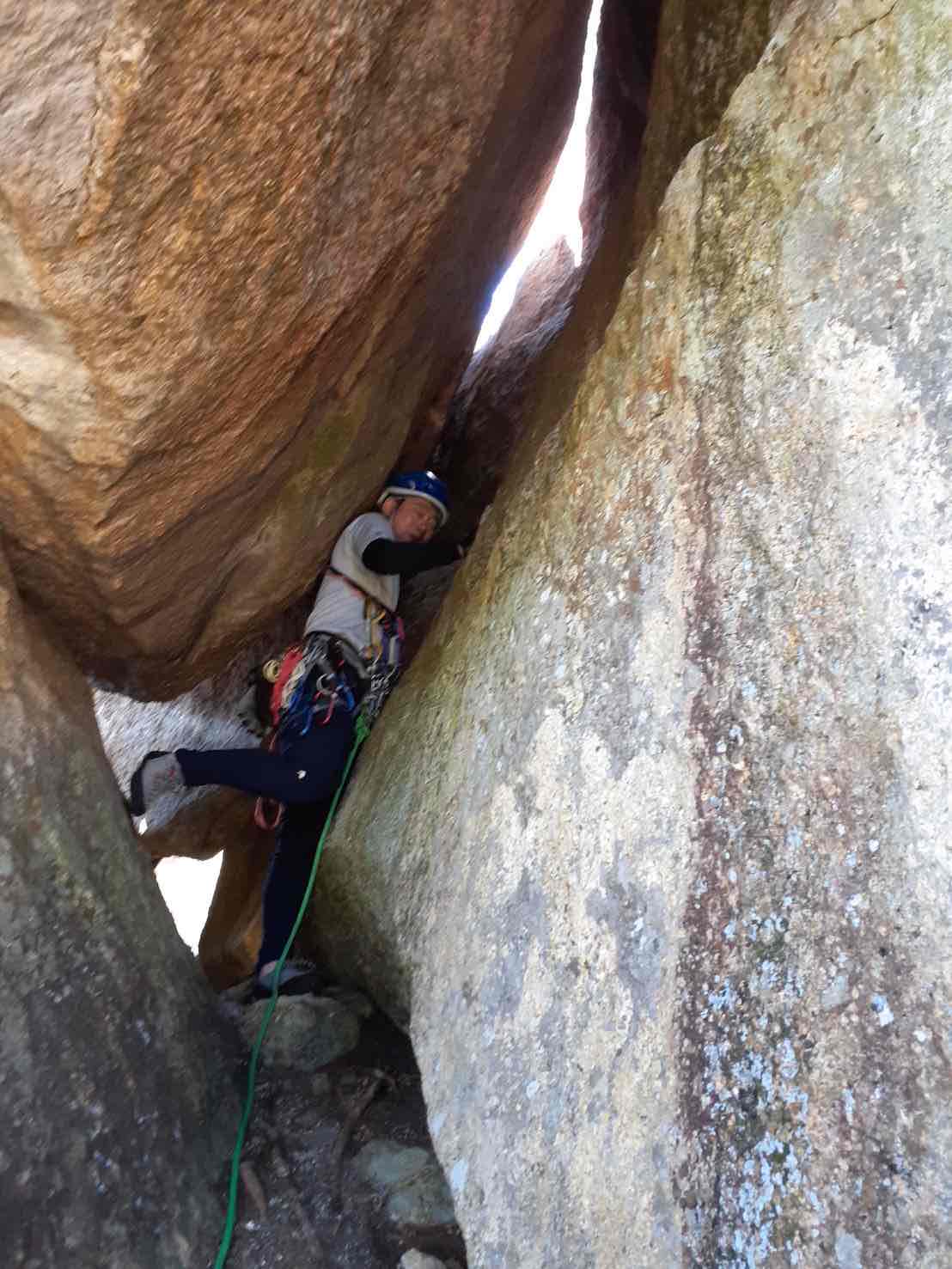 くじら岩は朝からボルダーがいっぱいで、その横を通って大貧民の取付きに行くと誰もいなくてさすがに貸切りです。大貧民は100岩では5.7となっているので簡単に見えますが、最新のトポでは5.8、しっかりしたクラックの技術と3P目は10mくらいノープロのスラブがあって、メンタルも試されるルート、前日のスラブ特訓の成果がありました。最終5P目はトンネルのチムニーをくぐってトップアウトするのですが、ここが狭くて本当にギリギリで体が挟まって身動きが取れず、ヘルメットもギアも全部外して20分以上奮闘してようやく抜け出すことができた。自分はもう登りたくないけど冒険的でお勧めです。