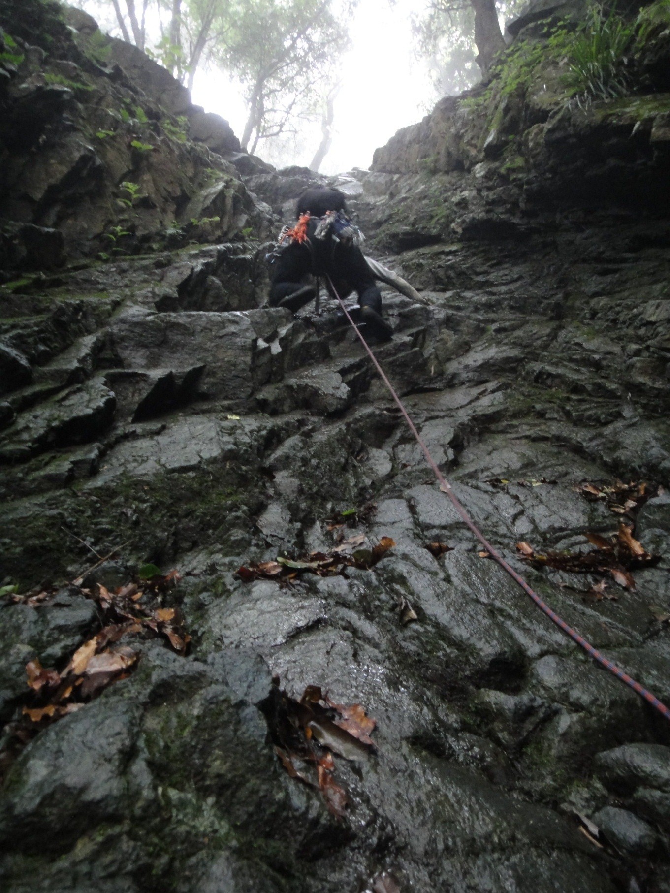 8:00 入渓。曇りの天気と相まって、光が入り込まず陰鬱な雰囲気の沢。水量が少ないので、どんどん遡行します。途中から、水が無くなり大滝8mは枯滝。登ること自体は面白いけど、水飛沫を浴びたいな~と思いながらも登攀終了。