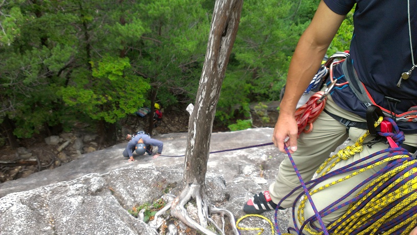 ガマルートは各ピッチが短いのですが5p目ぐらいから展望がひらけてきて出発したキャンプ場が遠くに見えます。6p目では、リードするには恐ろしい、支点のない箇所を通過します。左右の崖の切れ落ち方が半端じゃないので、落ちると結構大変なことになりそうです。ここでTは上部の溝に左足をジャミングしたのですが、予想よりもずっぽりはまってしまい、バランスを保ちながら抜くのが難しくてこずりました。7、8p目はあっさり突破して終了点へ。そこから50mの懸垂下降で基部へ戻ります。