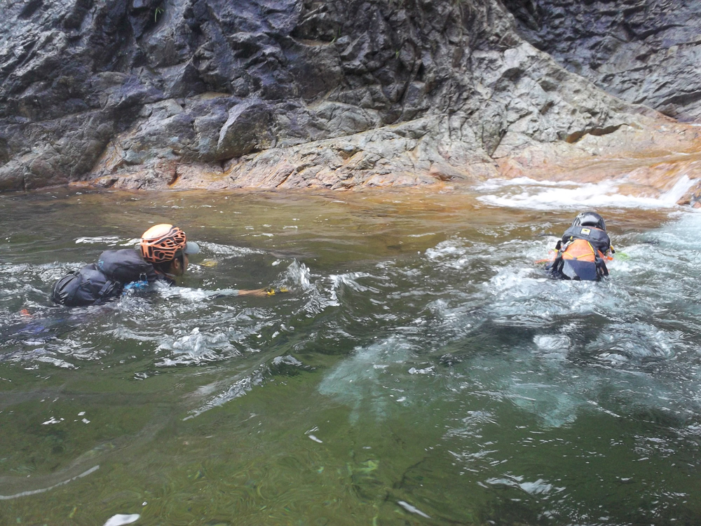 深い釜のある滝は、原則泳いで中央突破。いや~盛夏でもないので冷え冷え!