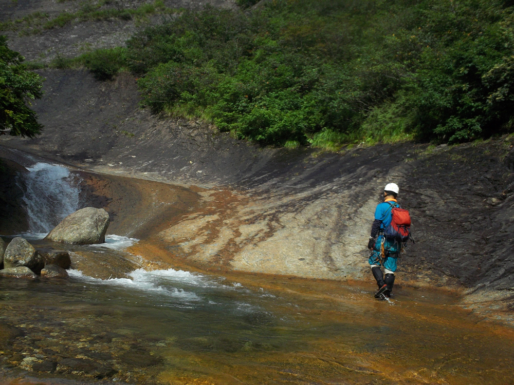 この沢は全体的に鉄分が多いそうで、赤茶げた岩肌が続き、