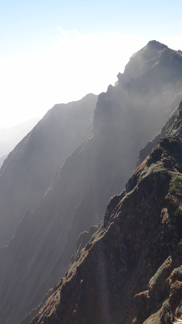井戸小屋沢ノ頭から先は傾斜は緩み低木も生えてくる。しかし尾根は切れていて、登山道が崩壊したトラバースも2箇所あり。登山道はほぼ万太郎谷側につけられているが、雪庇も万太郎谷側だろうから冬は景色の印象が違うかもしれない。