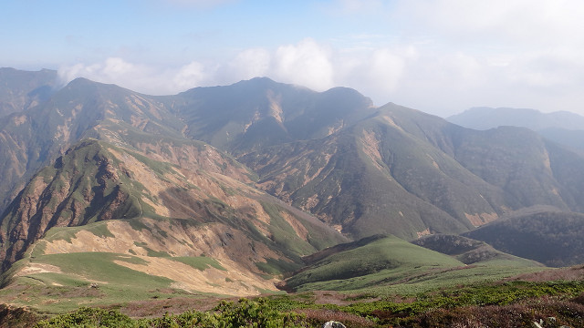 矢場ノ頭で唐突に万太郎谷を取り巻く山々の眺望が開ける。標高1490mだが、森林限界を越え風が急に強くなる。矢場ノ頭から少し下り風も強く体が冷えたので、カッパを着ようと思ったが、笹原の中を一直線に登るうちに気にならなくなる。笹原の稜線は柔らかく緩傾斜なので冬でも怖くはないだろう。しかし雪着きも良さそうなのでラッセルが思いやられる。
