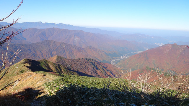 越後側の万太郎谷は終わりかけのブナの紅葉に赤茶色だが、上州側は緑の笹原で好対照。