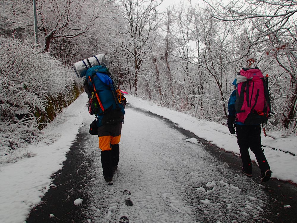 雪かぶりの登山道をトレースするのに苦労する。