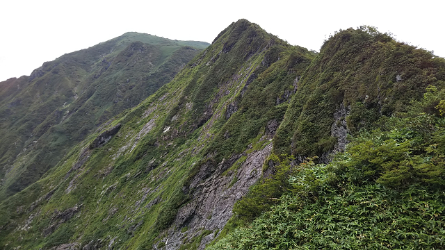 V字の要からは草付を避け堅い凹凸岩を選んで登る。手指と爪先と身体軸を行来するバランスをセルフコントロールされたリズムに乗せてゆく。集中力が高まり、何ピッチ登ろうが息苦しさすらない。ルンゼの変調を交え灌木帯にスラブを拾う。稜線を目指す藪漕ぎのバーバリズムは谷川岳の第四楽章か。