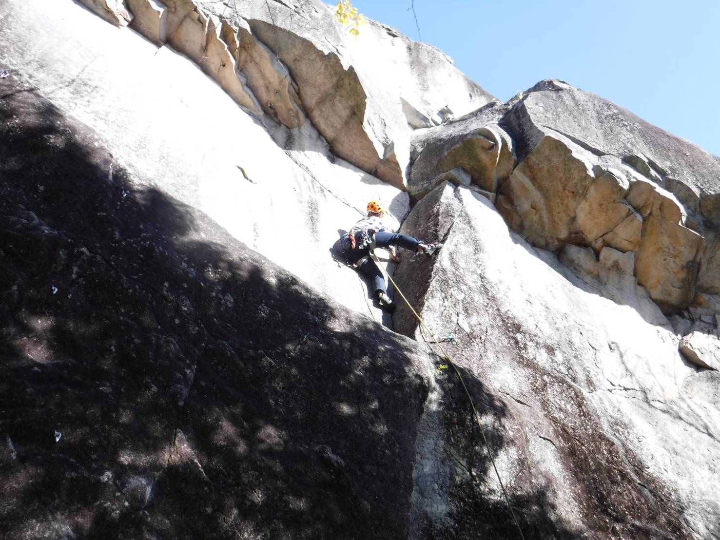 丑ノ倉は綺麗な花崗岩の一枚岩。メインの岩はハーフドームと命名され、確かに片側が垂直で反対がなだらかな形状や頂点のハング等、1/50スケールである。これが小川山あたりにあれば、一番人気になりかねないルート本数や構成なのだが、誰もいない。 まったく登る気のない河原さんにビレイをせがんで、「サニーサイドストリート」にロープを掛け、ロワーダウンしてくるが、今日は長濱女史のテンションが低くハーネスすら着けていないので、急いで「東面右上クラック」をフリーで登ってTR張り、ベテラン勢に登ってもらう。その隙に「への河童」にTRをかける。「乾杯」や「甘酒・利き酒」などのハング越えとマントルのあるルートが変化があって面白かった。