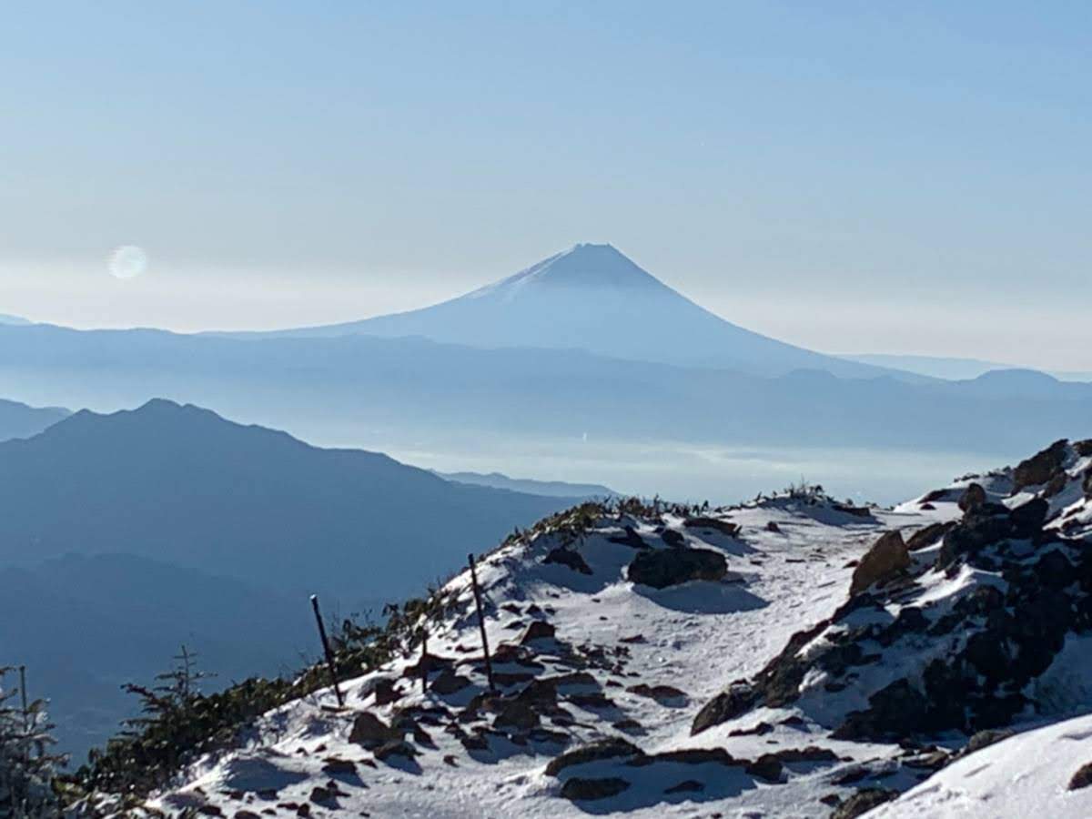 でもこの日は冬山には申し分のない晴天で、山頂からは北ア~中央ア~御岳~南ア~富士山…と、大パノラマが一望! 山梨側の富士山はやっぱりカッコイイ!