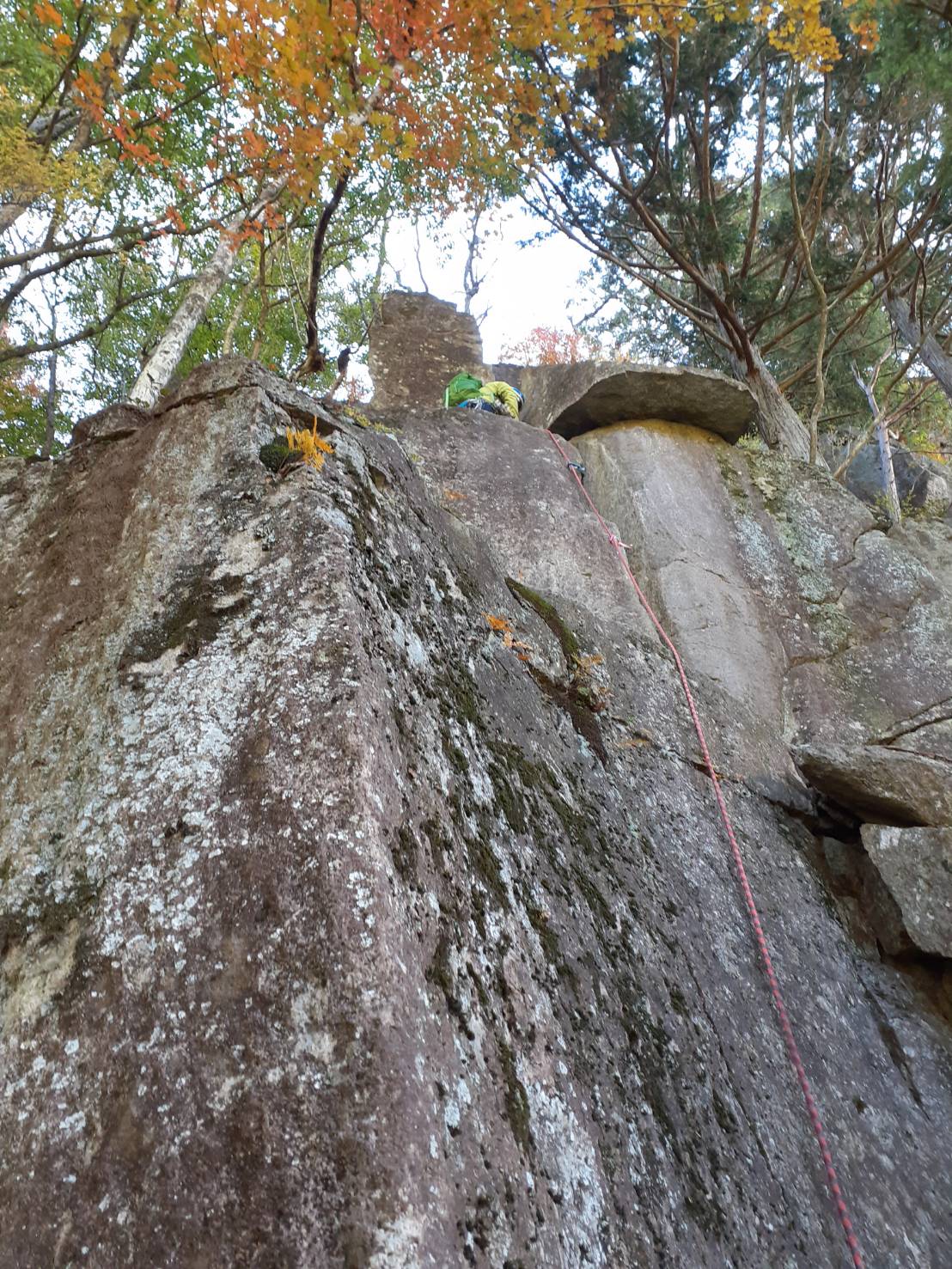 荒木さんは50mぐらい進んで止まった。お互いに小型トランシーバーをつけているので話が出来る。出だしは3mぐらいのスラブ壁、その先の空中にロープが伸びて木のある所で逆くの字に曲がっている。