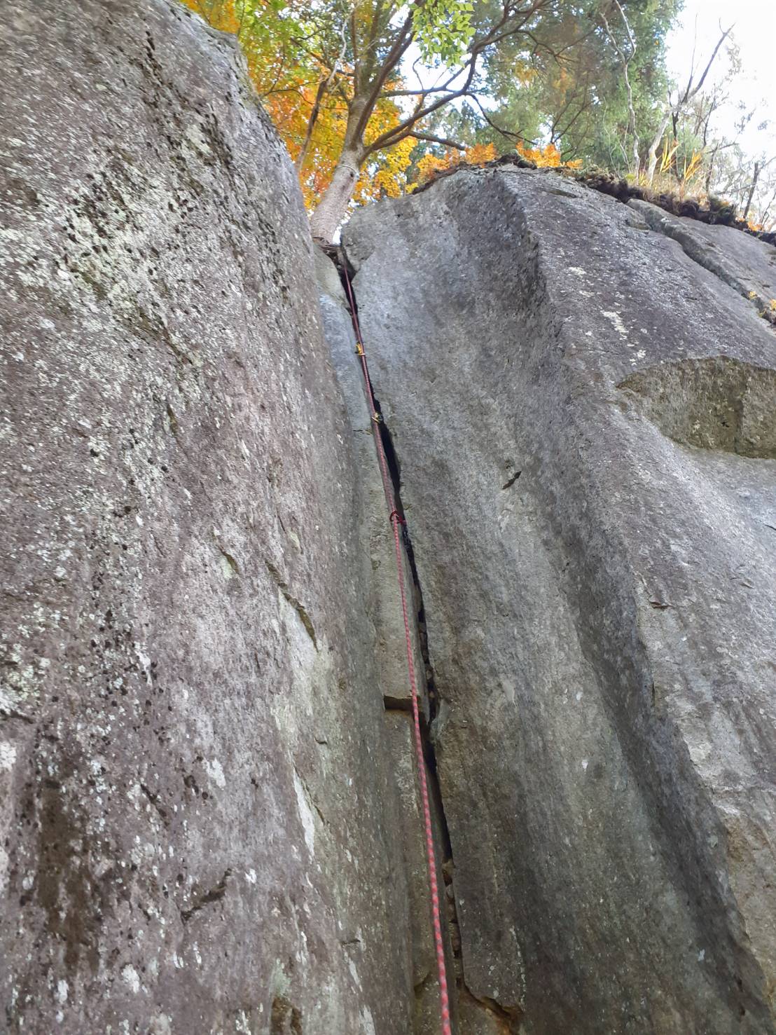今回の試練は岩場に向かう高速道路から。小仏トンネル内の事故で通行止めになり国道20号に迂回する。渋滞をくぐり抜けてようやく岩場にたどりつくとパラパラと雨を感じる。今日は雨の予報ではなかったのに。最悪の場合はクラックを登り終えたら降りると合意の上、登攀開始した。前には一組しかいない。(その人たちもクラックを登ったところでお先にと譲ってくれた。)