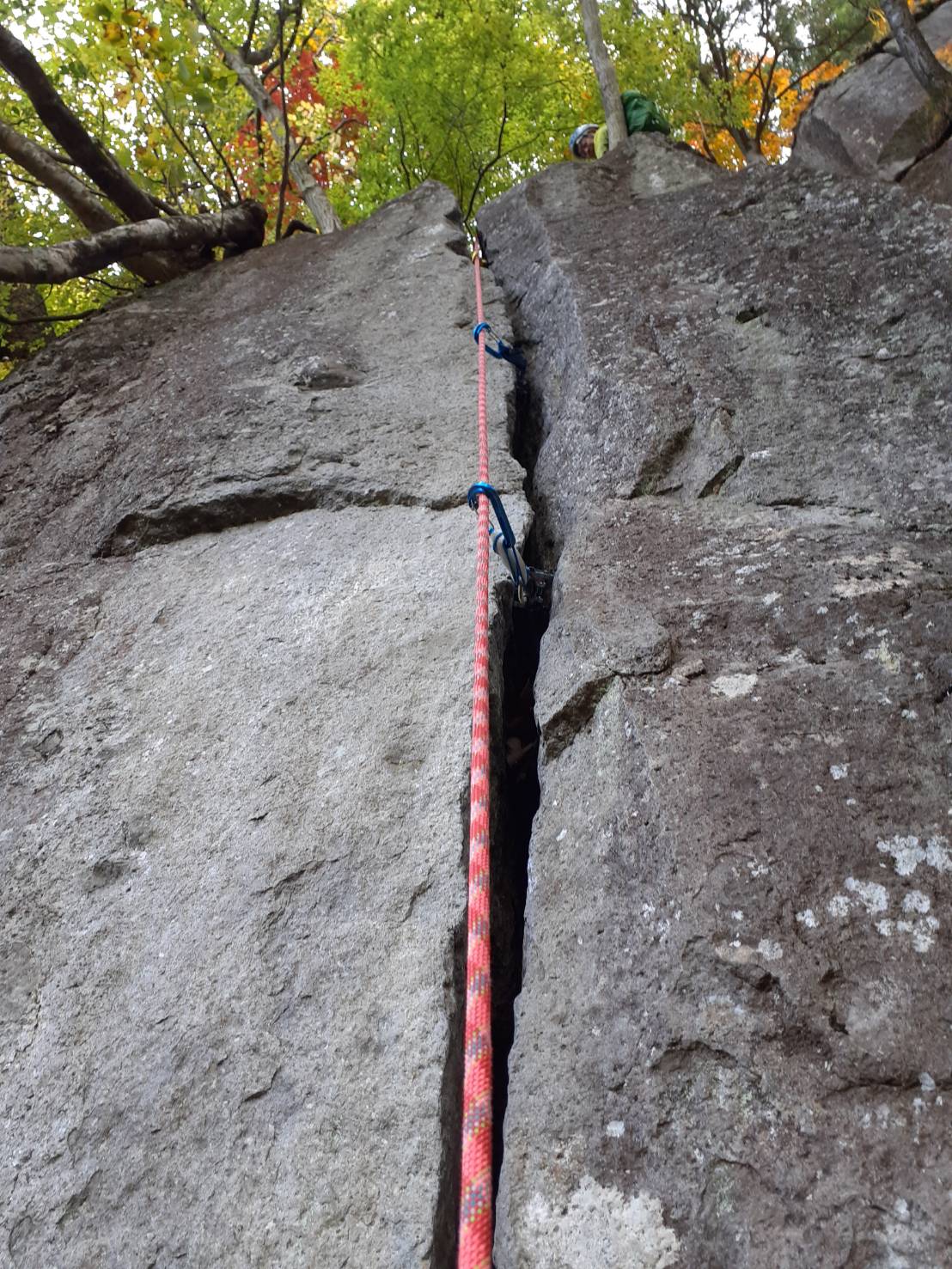 2ピッチ目のクラックは5.7だそうだが…。ダブルクラックになっており、右側はハンド、左の広い裂け目の奥にガバが続いており、左手をかけて右に引ける。足置きがなかなか難しくて奮闘、ロープを張ってもらう。抜け口が登りにくかった。これが5.7か…と思った。荒木さんはカム3個で登って行った。
