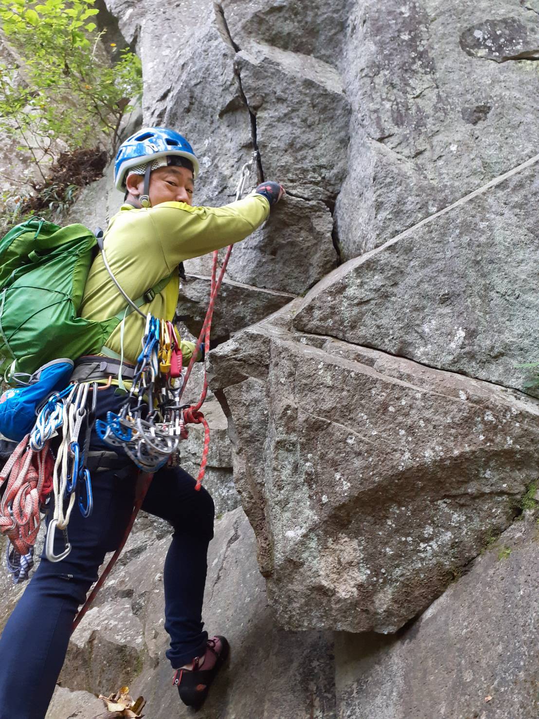 このルート、荒木さんは2度目だそうです。私は4~8ピッチ目は2度目だが最初のクラック3ピッチと鋏岩のフェースは初めてだ。前回登ったのはクラックのルート3ピッチが開拓される(2008年、篠原さんと松原さんにより)前で、左側の林の中のアブミ用ボルトとフィックスロープを使って登ったのだと思う。鋏岩はフェースではなく被った面の下をあぶみ(A2)で登った。