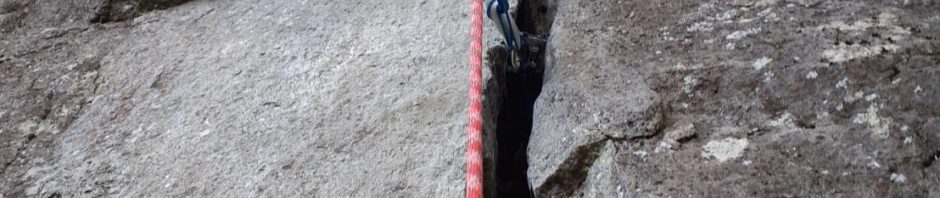 出だしはフィンガーサイズのクラック。指がかかりそうな所が何か所かあり、丸いふくらみを乗り越えて立つ。ムーブはバランシーで、フェースクライミングのように動く。上部は傾斜の強いややワイドのクラックを登る。フットジャムが出来ないと登れないが足を突っ込むと痛い。荒木さんは淡々とキャメロット#3を2個使って上部を登ったが。私はロープを張ってもらってやっと抜けた。(この最初のピッチでは知り合いのクライマーが落ちて足首を粉砕骨折したそうで、多分出だしで落ちたのだろう。)