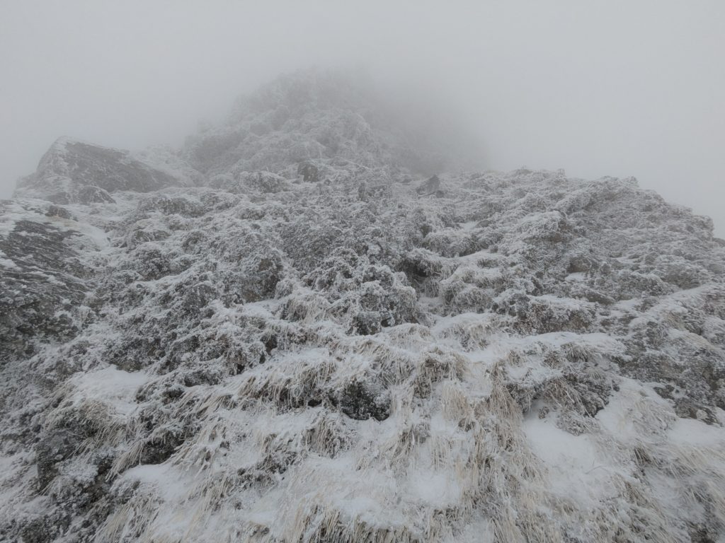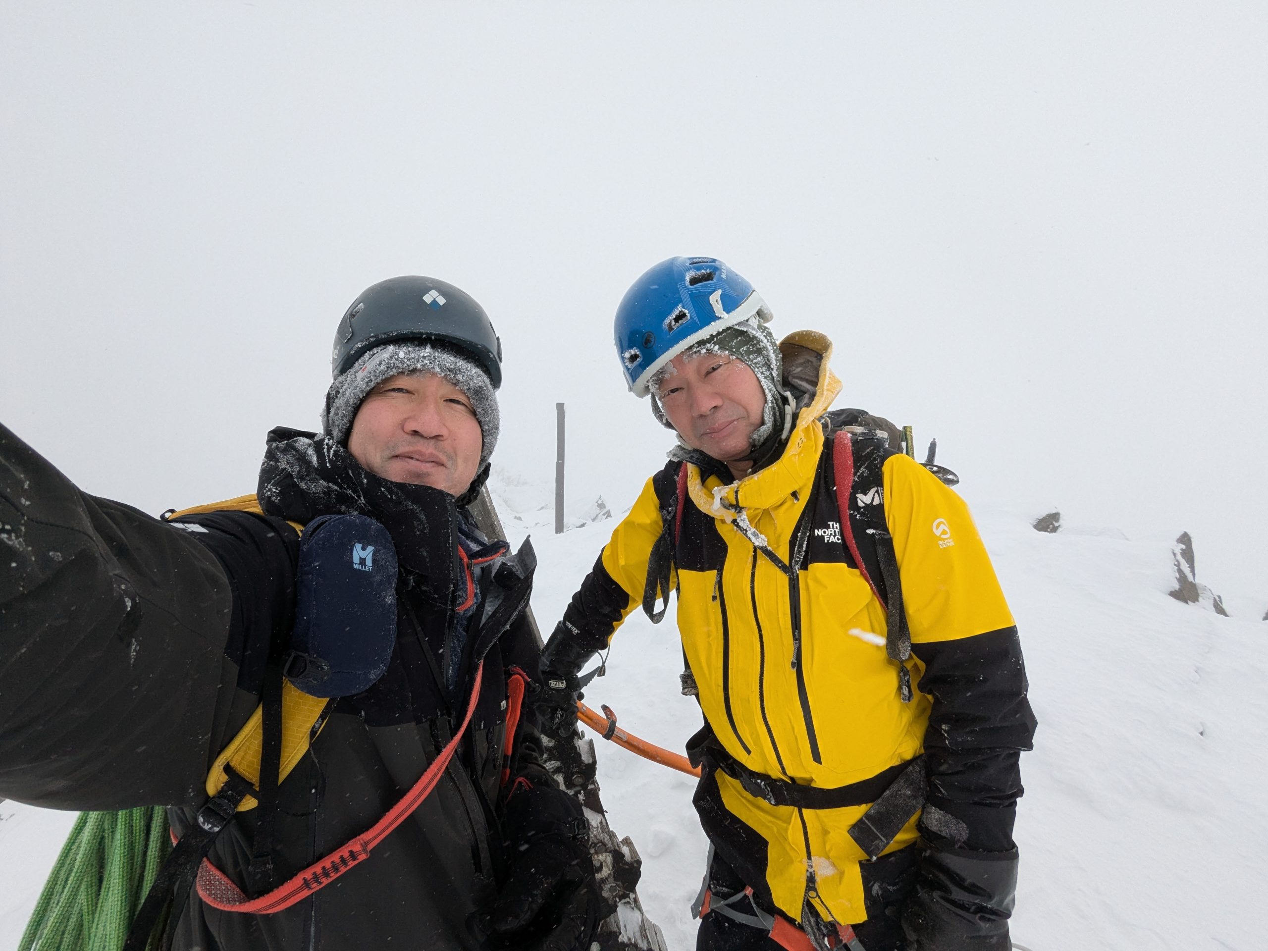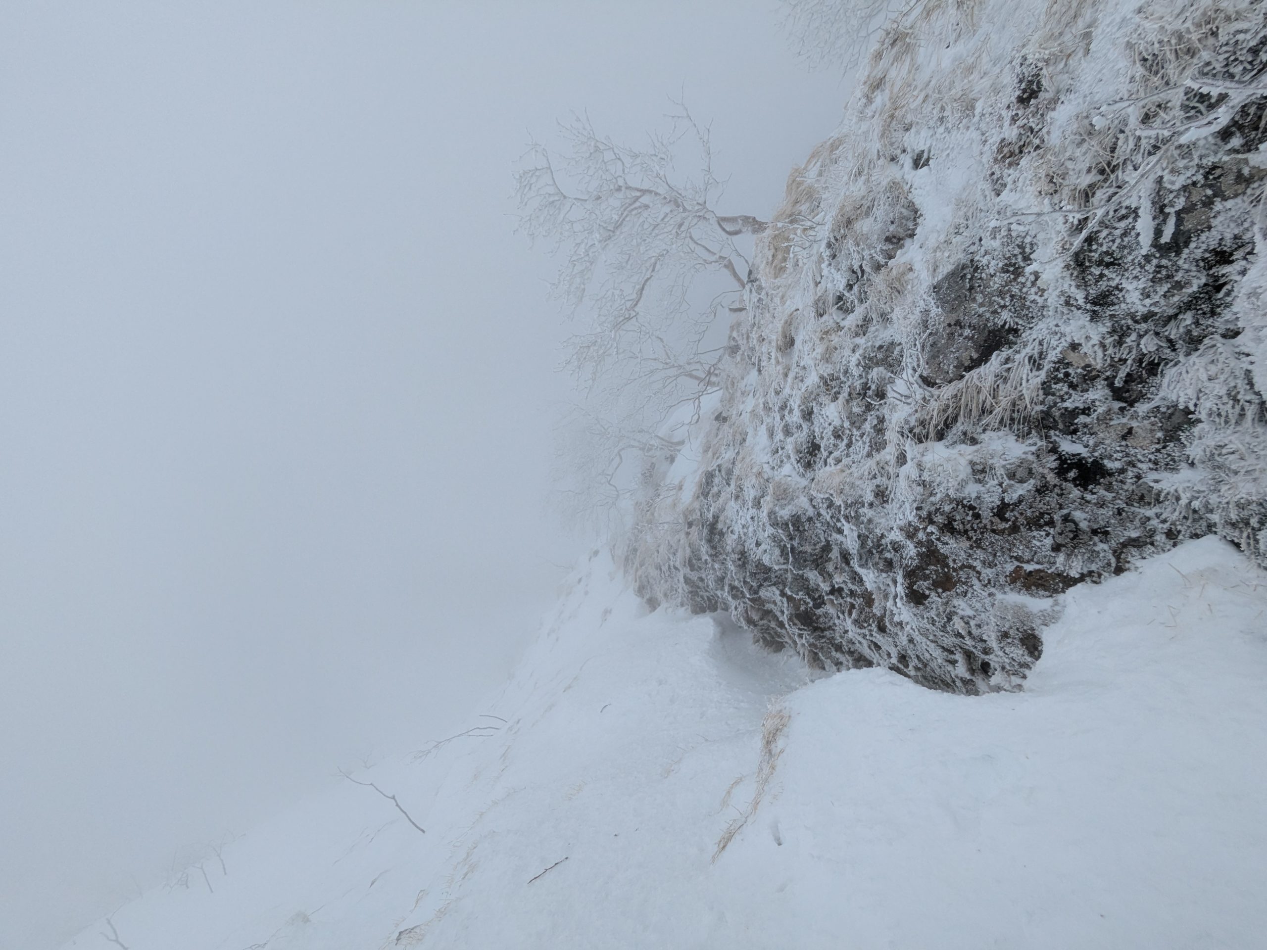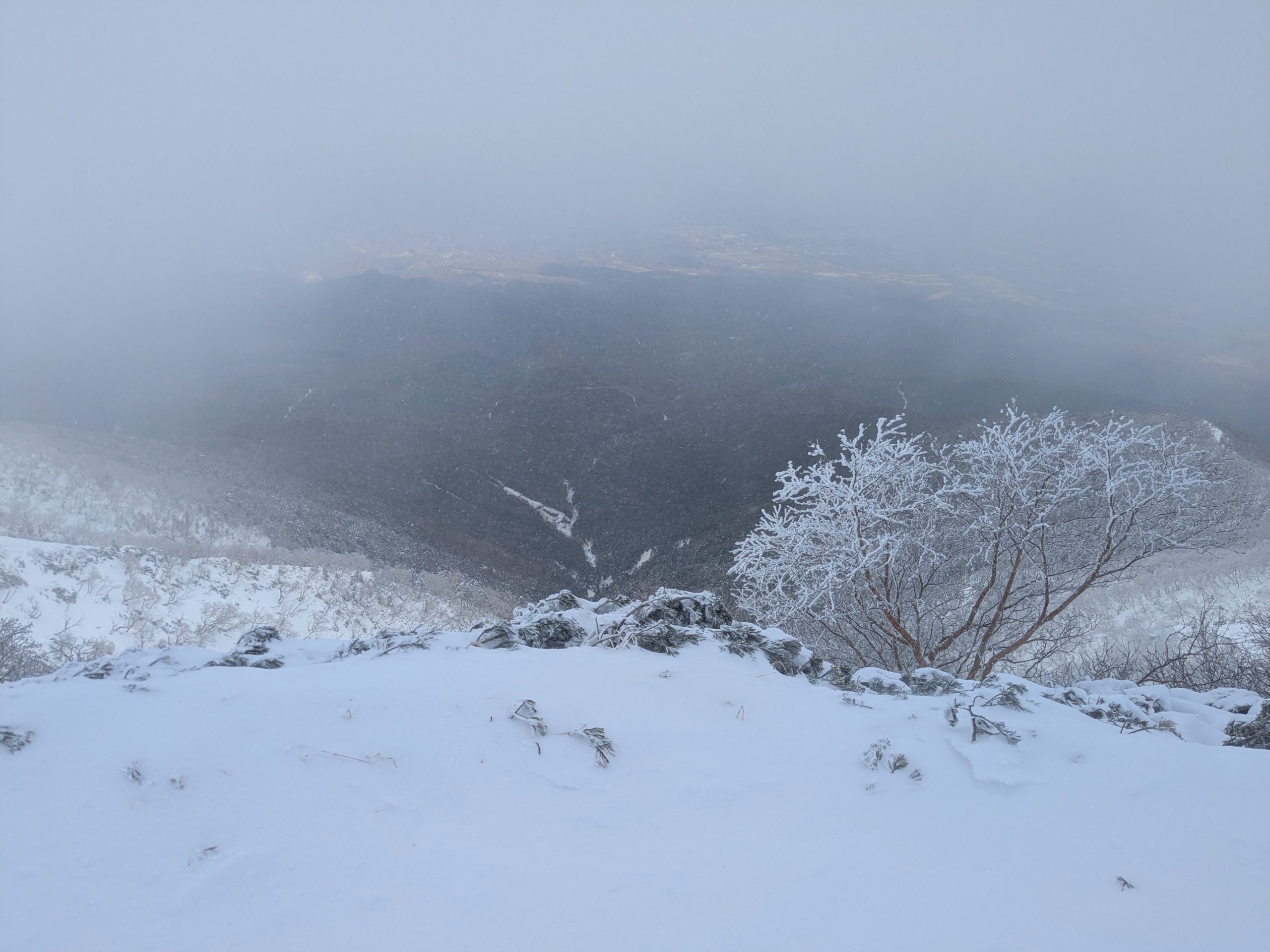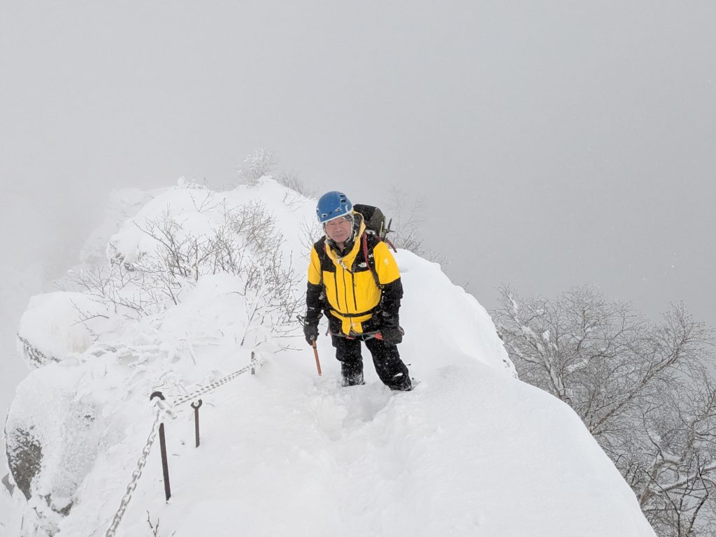 横岳山頂直下が一番難しく感じた。上に登りたくてもホールドがとても遠く、腹の辺りは若干被り、岩にへばり付く。腹と岩の間から吹き上がる風雪で頭から首まで雪塗れになり、顔が痛め付けられる。上からも雪がばらばらと落ちて来て私をなじる。時間を掛ければ掛ける程危険になると本能的に感じて、ピッケルを頭上に刺して、自分を信じて登り切った。 横岳山頂に着くと、今まで我々を覆っていた霧が抜け、僅かながらも下界の展望があった。