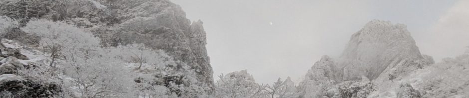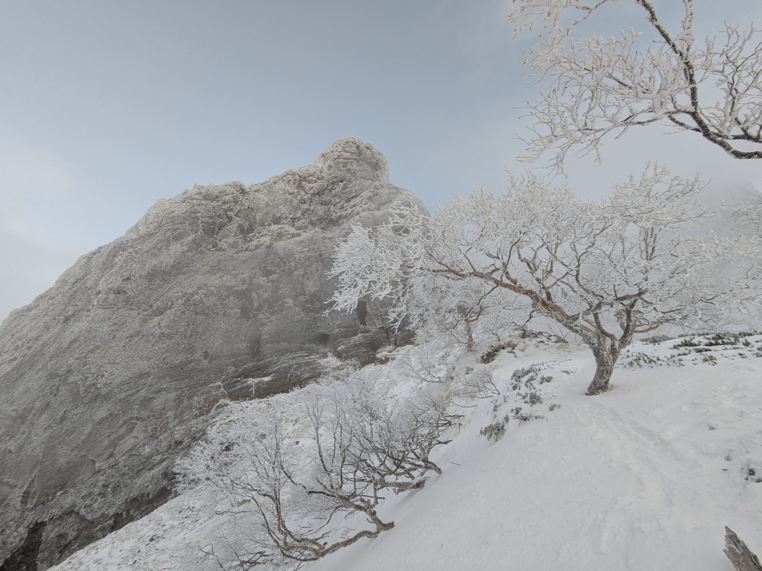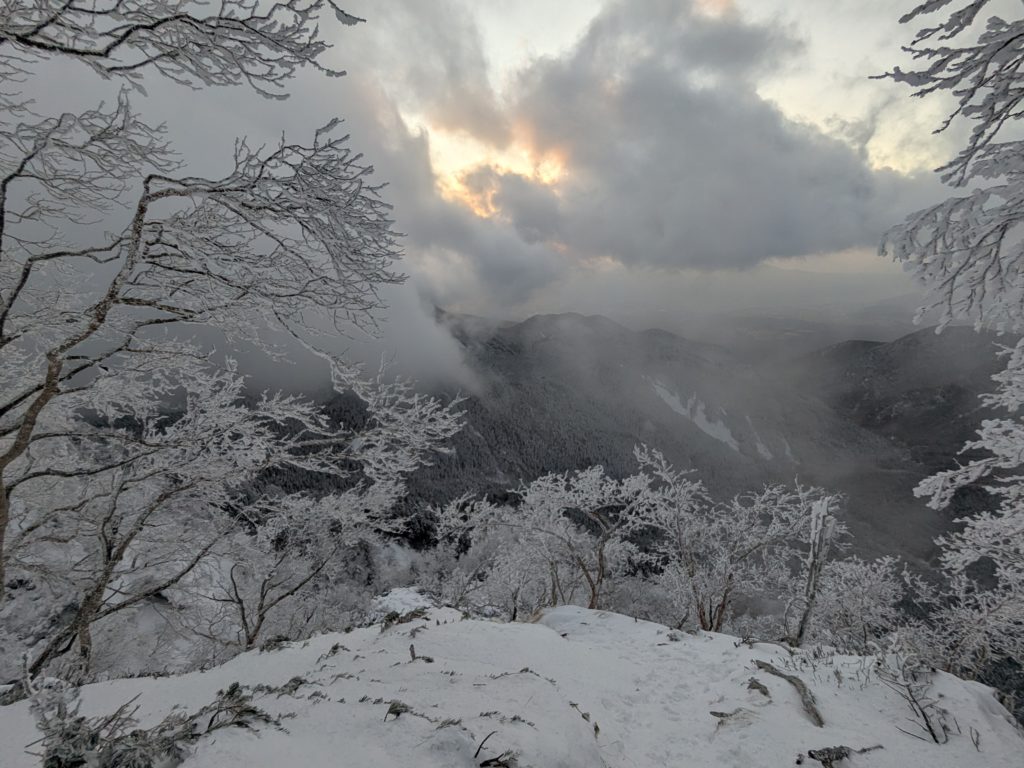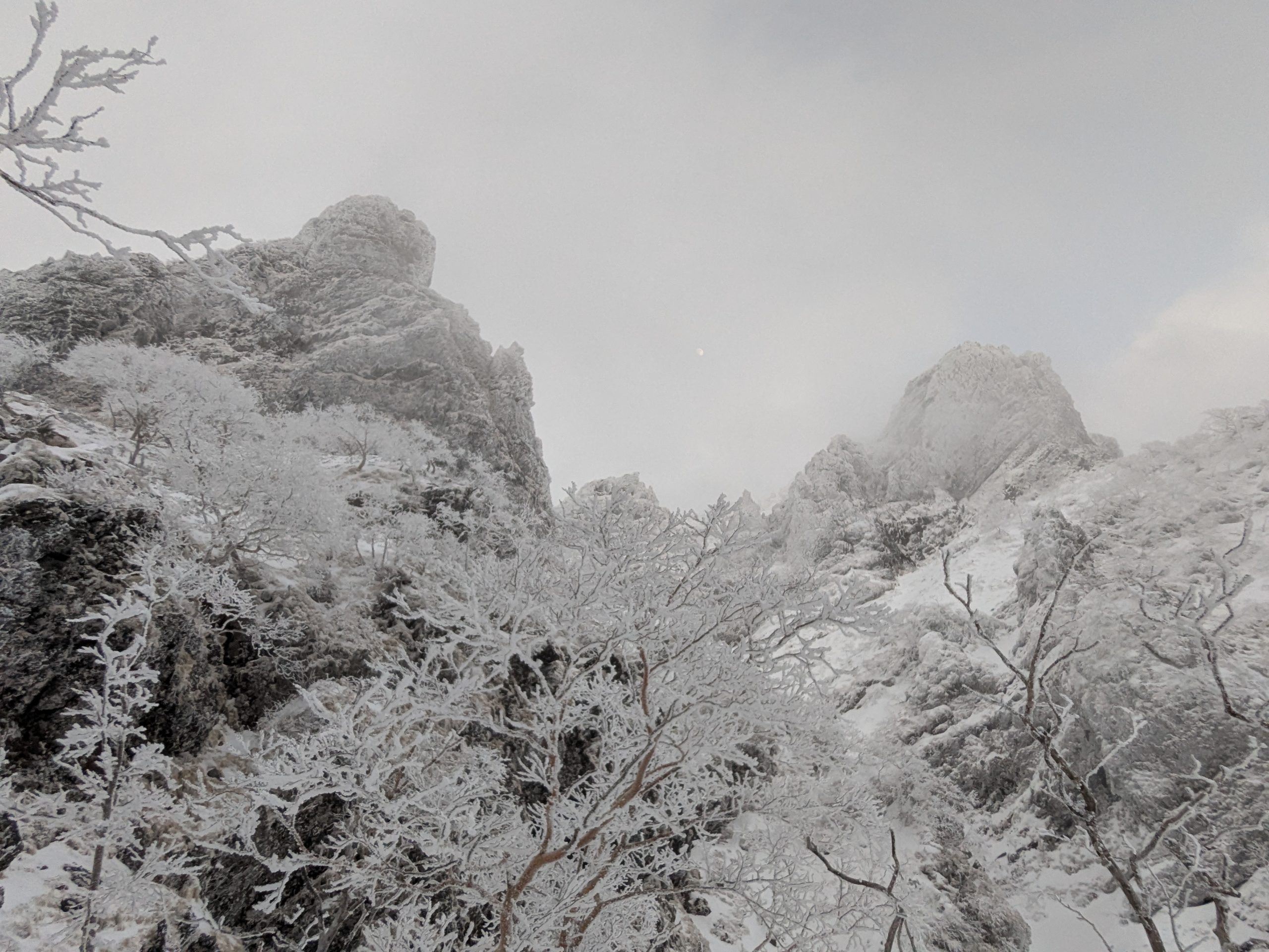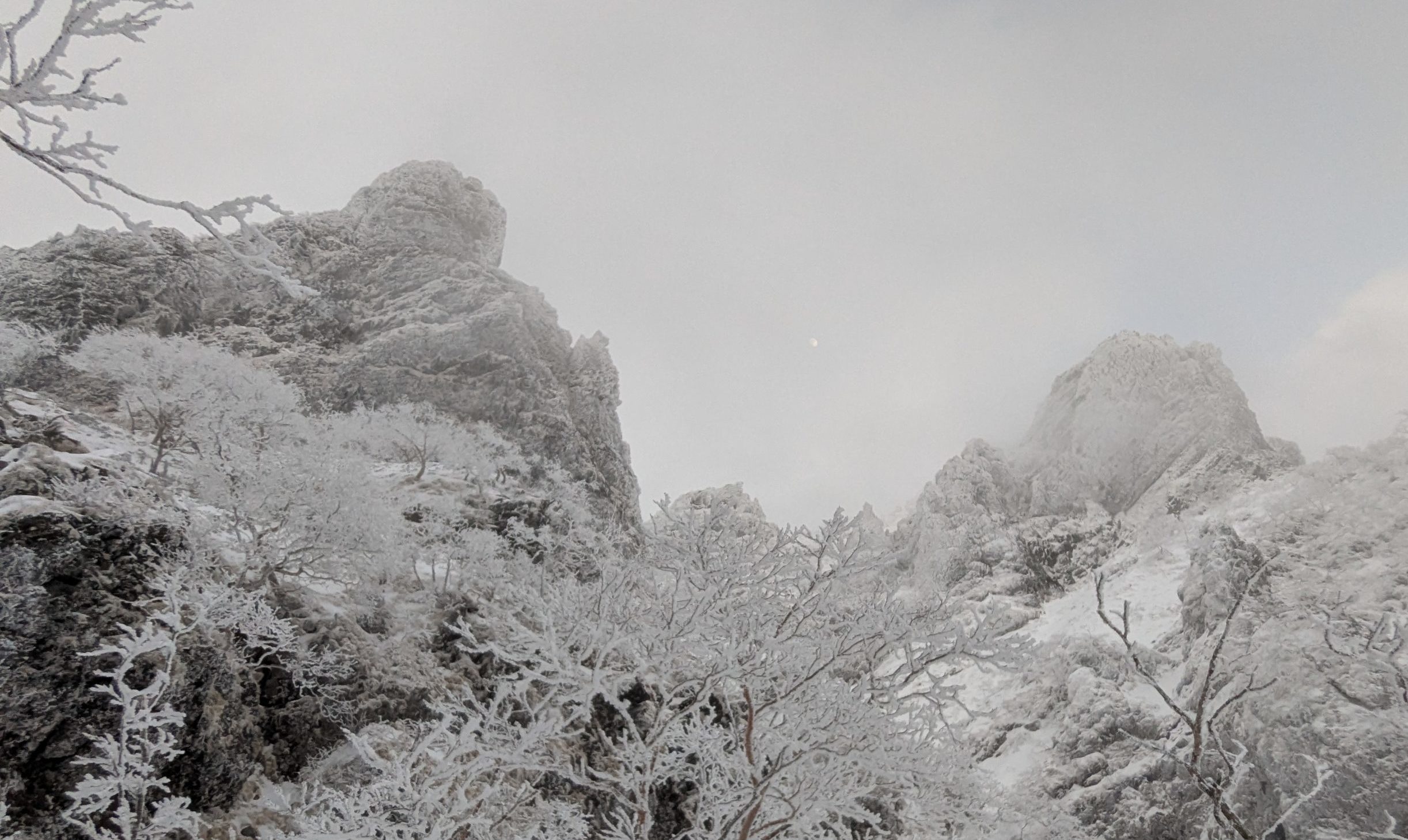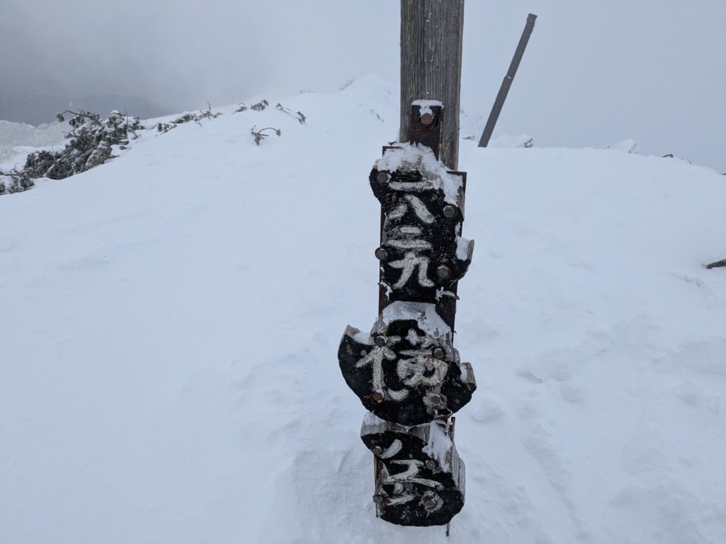 横岳山頂直下が一番難しく感じた。上に登りたくてもホールドがとても遠く、腹の辺りは若干被り、岩にへばり付く。腹と岩の間から吹き上がる風雪で頭から首まで雪塗れになり、顔が痛め付けられる。上からも雪がばらばらと落ちて来て私をなじる。時間を掛ければ掛ける程危険になると本能的に感じて、ピッケルを頭上に刺して、自分を信じて登り切った。 横岳山頂に着くと、今まで我々を覆っていた霧が抜け、僅かながらも下界の展望があった。