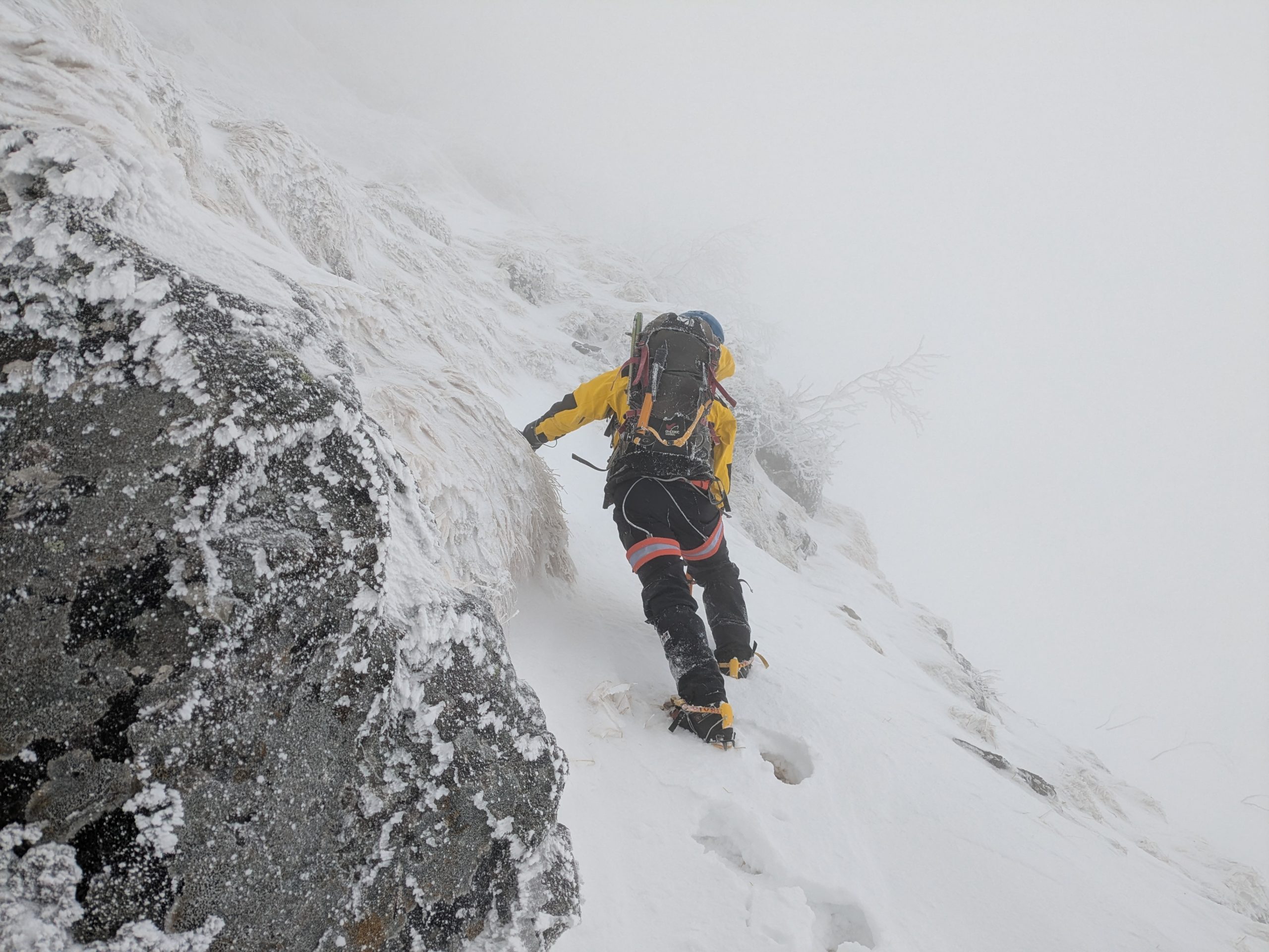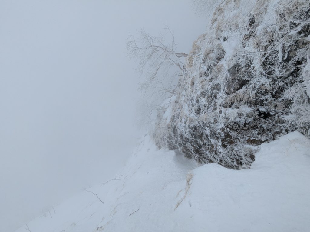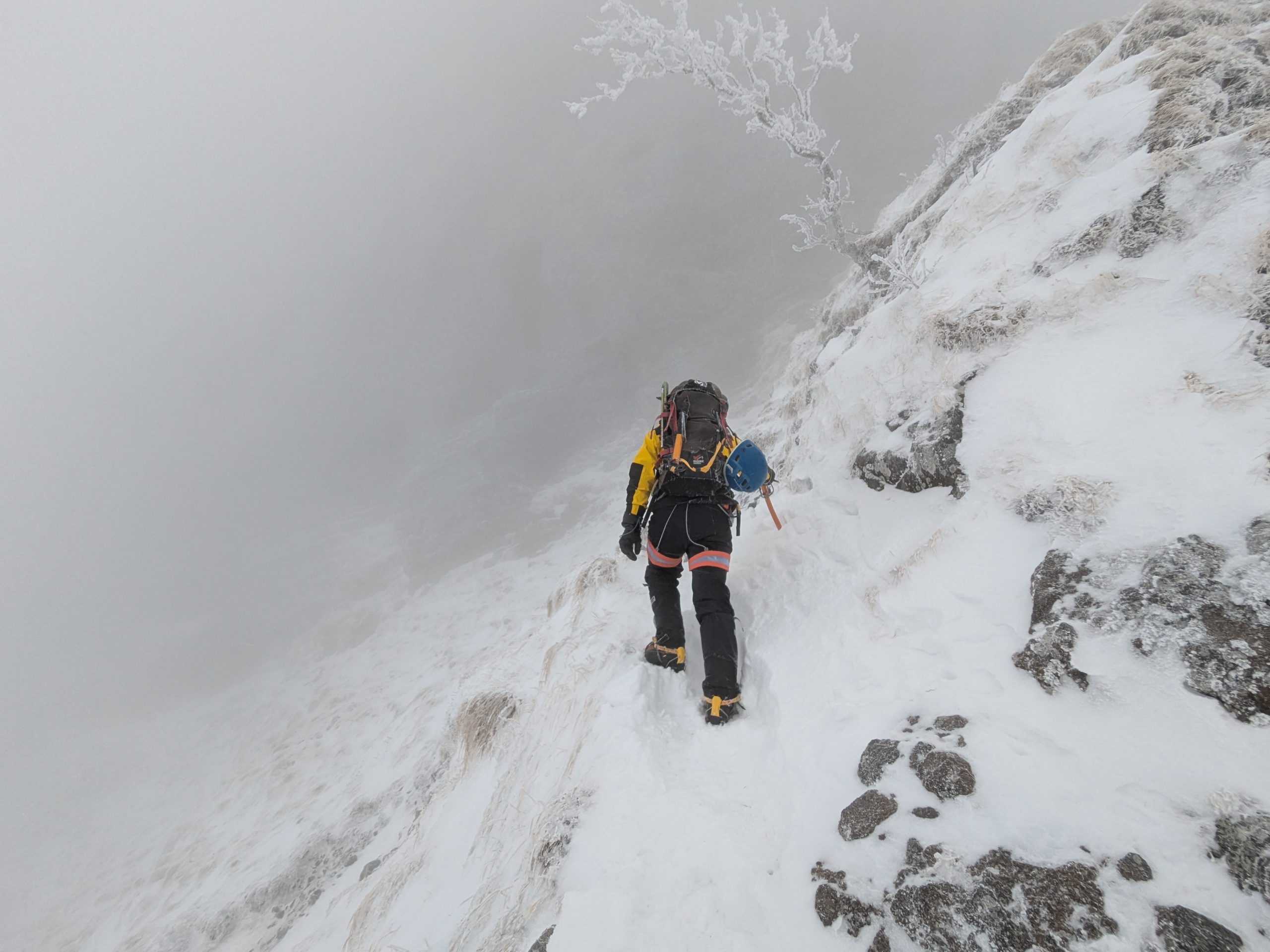 大同心の手前に着くと、そこは厳しい雪山の様相だった。風はそこまで感じなかったが、霧で見通しが効き辛い。小同心クラックの取り付きに行くのにトラバース道が見えず、危険な斜面に入り戻ったりもして、ようやく取り付く。到着までが一苦労だったが、簡単には諦めない粘り強さが山でも仕事でも深みを増すと思っている。決して無理はいけないが。
