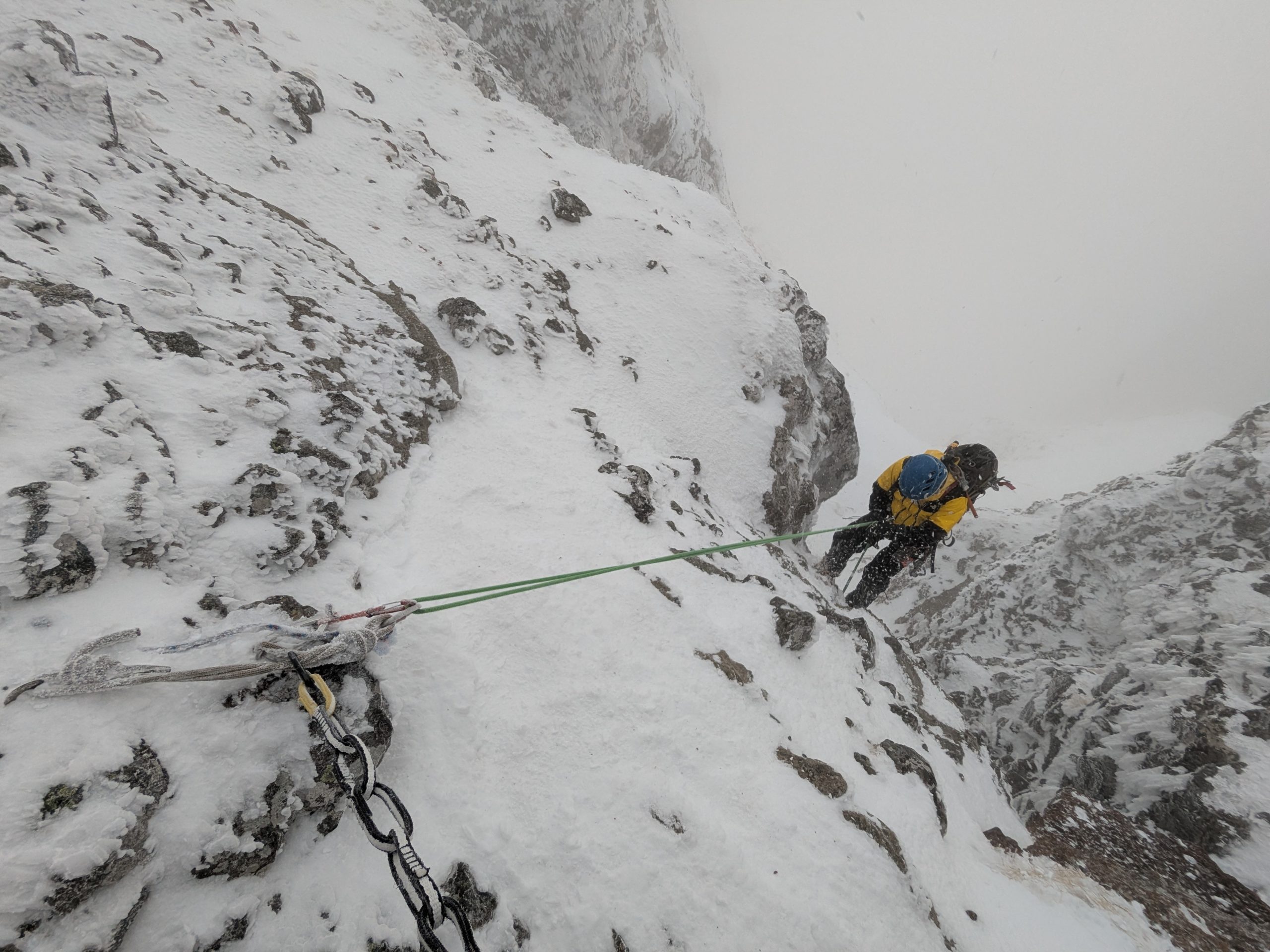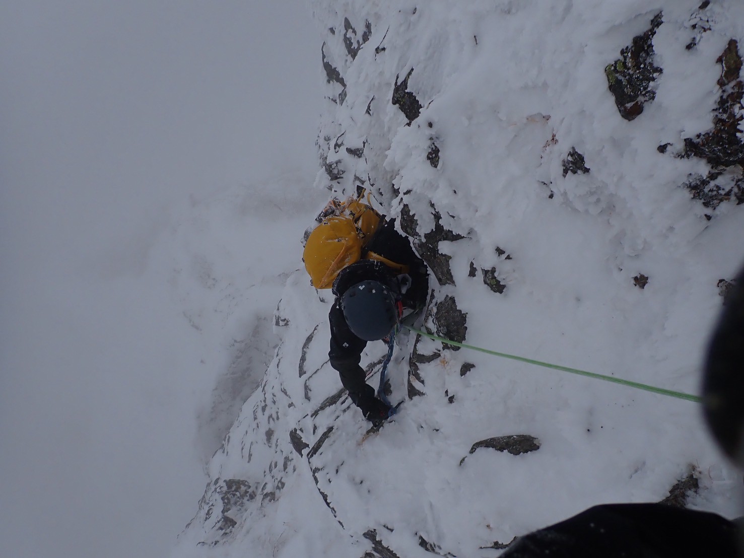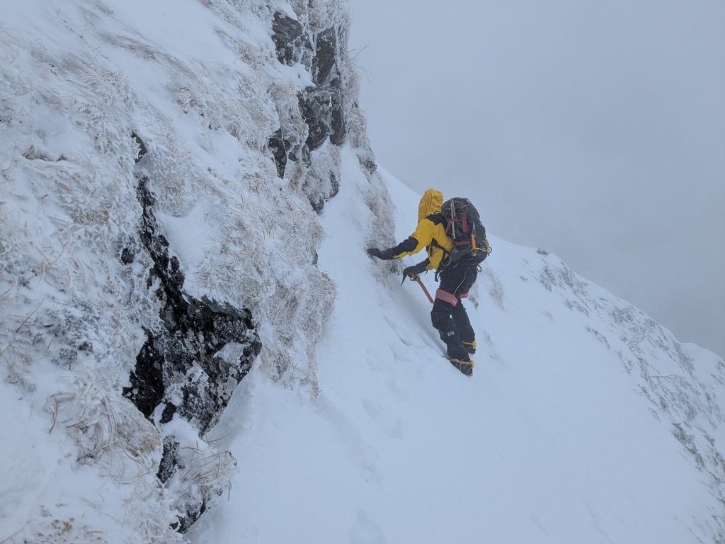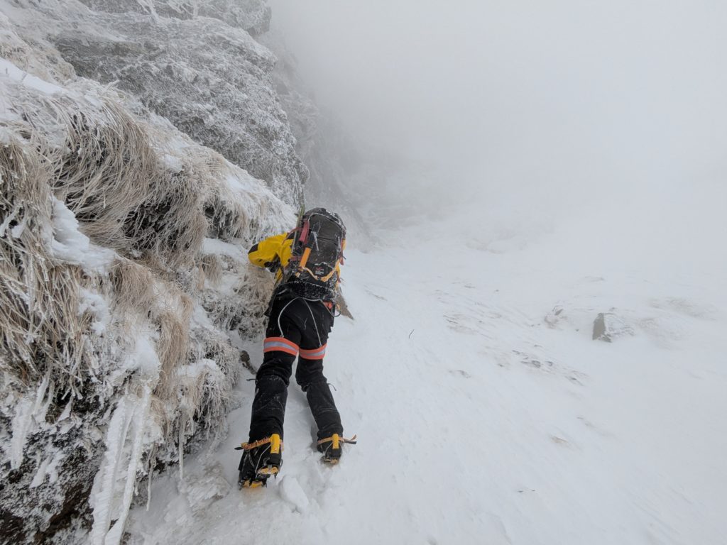 大同心の手前に着くと、そこは厳しい雪山の様相だった。風はそこまで感じなかったが、霧で見通しが効き辛い。小同心クラックの取り付きに行くのにトラバース道が見えず、危険な斜面に入り戻ったりもして、ようやく取り付く。到着までが一苦労だったが、簡単には諦めない粘り強さが山でも仕事でも深みを増すと思っている。決して無理はいけないが。